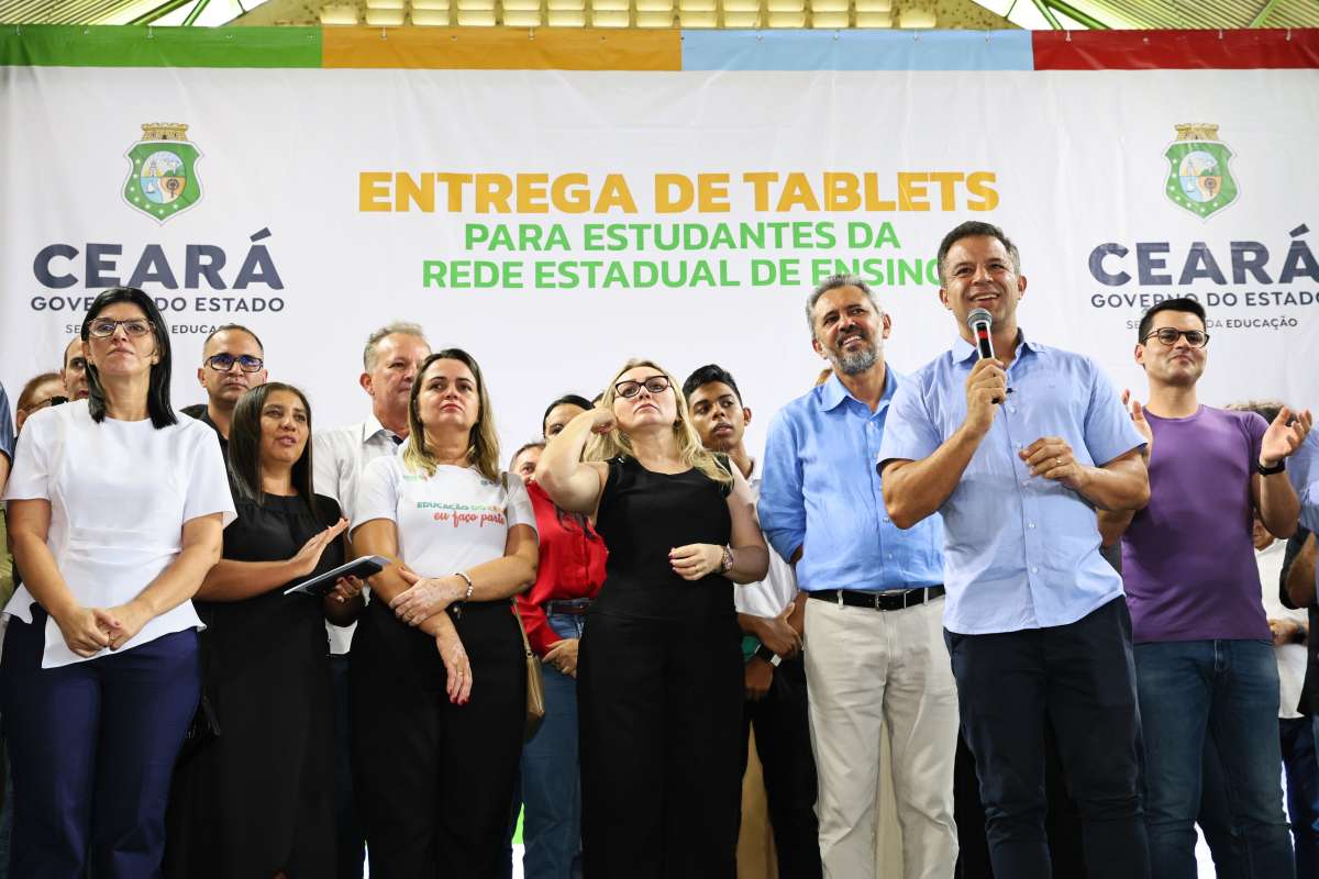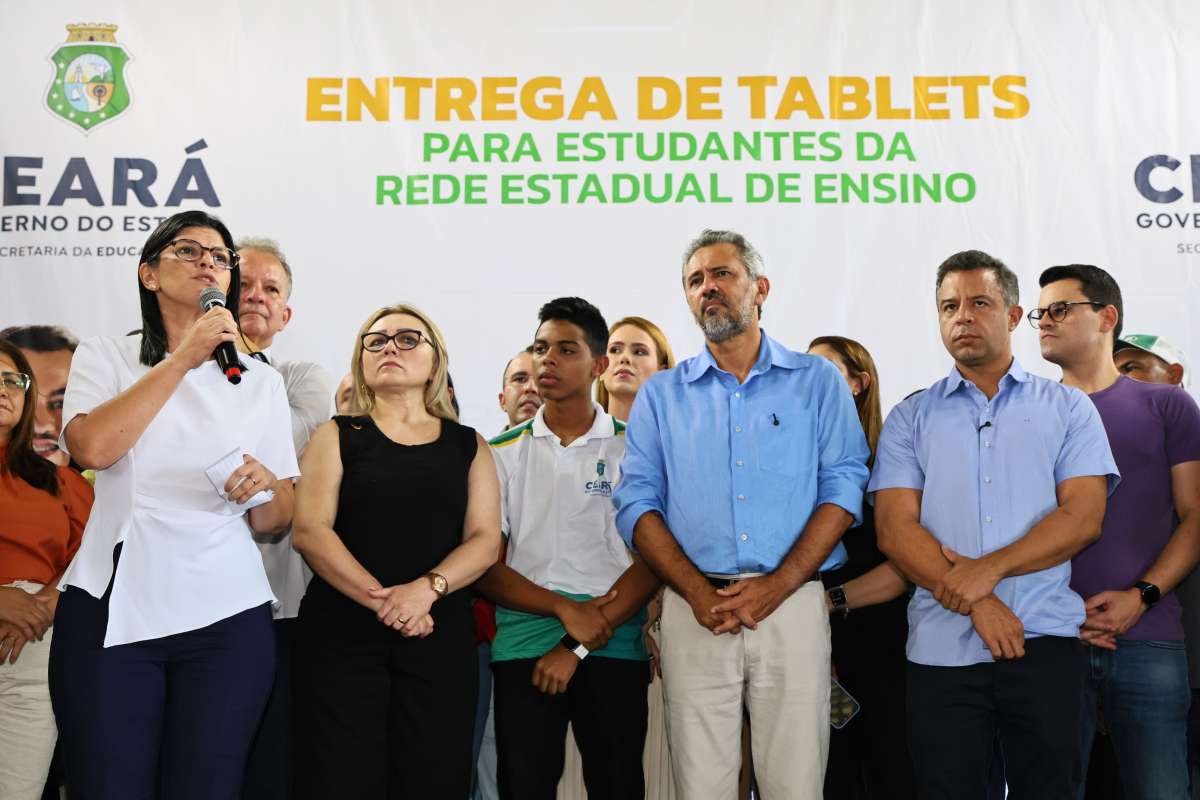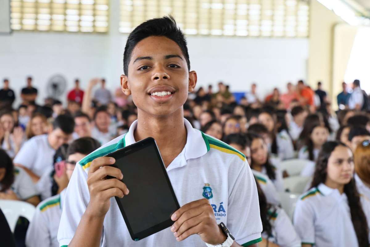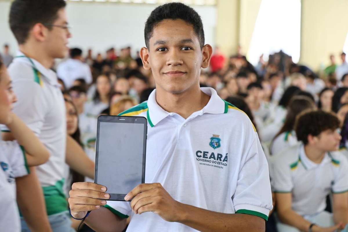 No total, foram 553 tablets entregues aos estudantes do 2º ano do Ensino Médio da rede estadual no município. Um deles, que discursou representando os colegas, foi Pablo Jonathas, do curso técnico em Agroindústria da EEEP Plácido Aderaldo Castelo. Durante sua fala, o aluno ressaltou que a educação é o caminho para transformar o futuro e agradeceu pelo equipamento recebido.