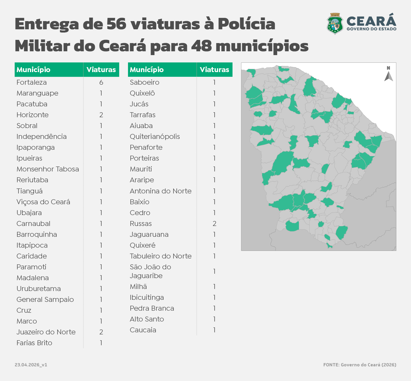 Os veículos, do modelo Jeep Commander, serão destinados para Fortaleza e outros municípios da Região Metropolitana e interior do estado, como Penaforte e Araripe, no Sul do estado, além de Barroquinha e Viçosa do Ceará, ao Norte do estado. A atuação será em diversas frentes, do policiamento ostensivo às áreas especializadas.